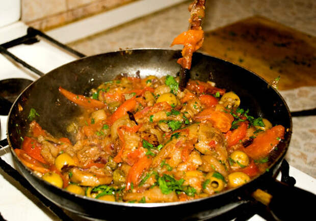 Для приготовления понадобятся: два больших баклажана; одна маленькая красная луковица; два зубчика чеснока; 0,5 пучка свежей петрушки (15 г); две ст. л. соленых каперсов; одна горсть зеленых оливок; пять крупных спелых помидоров; оливковое масло; одна ч.л. с горкой сушеного орегано; две-три ст. л. качественного уксуса на травах; две ст. л. нарезанного миндаля(по желанию). Крупно нарезать баклажан, мелко нарезать лук, измельчить чеснок. Отделить и нарезать листья петрушки, а далее мелко нарезать стебли. Промыть, замочить и процедить каперсы, удалить косточки из оливок. Крупно нарезать помидоры, поджарить миндаль до светло-коричневого цвета. В большой сковороде на небольшом количестве оливкового масла разогреть на слабом огне кусочки баклажана и орегано, добавив немного морской соли. Все перемешать, чтобы баклажаны равномерно покрылись маслом. Греть на сильном огне около пяти минут, все время встряхивая. Когда баклажаны стали золотистыми, добавить лук, чеснок и стебли петрушки. Если стало сухо, добавьте масла. Через пару минут положить высушенные каперсы и оливки, сбрызнуть травяным уксусом. После того, как уксус испарится, добавить помидоры и тушить около 15 минут или до готовности. Перед подачей на стол попробовать на вкус, приправить перцем, солью, оливковым маслом и посыпать нарезанными листьями петрушки и миндалем. Напомним, что шеф-повар поделился рецептом вкуснейшего жульена: "Отправьте в духовку на...". Также Politeka писала, что шеф-повар поделился оригинальным рецептом абрикосового пирога: «Вы гений!». А еще Politeka сообщала, что шеф-повар поделился рецептом быстрого хрустящего завтрака: «Боже, как вкусно!».