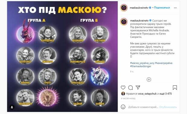 Шоу "Маска" приближается к концу, а это значит, что скоро зрители узнают, кто прятался под всеми масками В субботу, 3 апреля, в новом выпуске шоу "Маска" свои личности рассекретили сразу три главніх героя, передает Politeka.net. Звездные детективы, Оля Полякова, Настя Каменских, Андрей Данилко, Олег Винник и DZIDZIO, вместе со зрителями пришли в восторг.