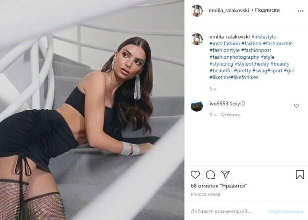Так, модель предстала в черном облегающем топике, который оголил стройную талию и упругий животик. Топ был пошит так, что одно плечико красотки было оголено, а одна рука была скрыта под тканью. Также Ратаковски была в облегающей юбочке, натянув по бокам веревочки, тем самым сделав наряд еще короче. Блестящие чулки в сеточку обтянули стройные ножки и смотрелись на них идеально. Сверкающие браслет и сережки дополнили образ. А прическа волнами - смотрелась просто роскошно. За пять часов пост собрал около 70 лайков и один комментарий: "Секси", - написал пользователь сети. Однако посты на подтвержденной странице Ратаковски моментально набирают тысячи лайков, ведь она - "горячая крошка". Напомним, Эмили Ратаковски позировала в коротком платье расцветки "зебра" и в такой же шляпке. Причем, на ногах девушки – красные босоножки на высоком каблуке. Поклонники восхитились свежим луком знаменитости, искупав Эмили в лайках, однако не написав ни одного комментария. Ранее мы писали, что Эмили Ратаковски надела короткий жакет на одной пуговице, под которым, казалось, нет белья. Грудь звезды красиво выпирала. Длина наряда позволила рассмотреть упругий животик модели - все-таки она такая жгучая. Рельефы ее тела просто завораживают. К слову, звезда также изменила цвет волос. Напомним, что яркая Эмили Ратаковски посветила сочным арбузиком, взбудоражив фантазию: с такой не заскучаешь. Как сообщала Politeka, эффектная Ратаковски посветила упругим "орешком" в атласном белье: "Нагибайся!". Также Politeka писала, что дерзкая Ратаковски подразнила видом своих богатств без лифчика: эти формы сводят с ума.