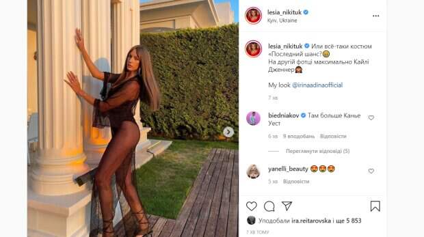 Комбез из сеточки черного цвета не только не скрыл ее фигуру, но и подчеркнул ее прелести. Под сетчатым нарядом был красивый черный сдельный купальник. Свой лук звезда дополнила красивый макияжем. И добавила, что в таком образе она максимально похожа на фигуристую Кайли Дженнер. "Или всё-таки костюм Последний шанс?