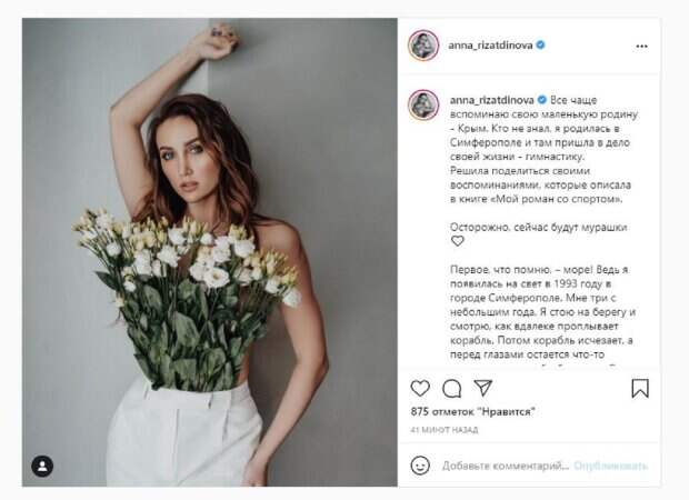 Но не много украинцев знает, что девушка родилась в Крыму, о чем и решила Анна вспомнить в последней публикации: "Все чаще вспоминаю свою маленькую родину - Крым. Кто не знал, я родилась в Симферополе и там пришла в дело своей жизни - гимнастику. Решила поделиться своими воспоминаниями, которые описала в книге «Мой роман со спортом». Осторожно, сейчас будут мурашки Первое, что помню, – море! Ведь я появилась на свет в 1993 году в городе Симферополе. Мне три с небольшим года. Я стою на берегу и смотрю, как вдалеке проплывает корабль", - написала красотка. На фото Анна была топлес, надев только штаны, а свои пикантные места прикрыла цветами. Девушка смотрела в камеру, поражая чувственным взглядом. Фанаты сразу начали писать комментарии под фото: "Плачу", "Очень трогательно, прямо в сердце", "В 1993 я в школе учился уже". Напомним, фаворитка Ямы из "Танців з зірками" рассказала о своем разочаровании А еще Politeka писала, что фаворитка Ямы из "Танців з зірками" Ризатдинова в купальнике дала пример для подражания Также Politeka сообщала, что фаворитка Ямы из "Танців з зірками" срочно покинула Украину, и дело не в отдыхе