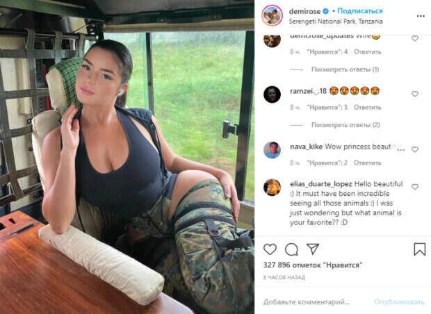 Именно поэтому даже на прогулках во время отдыха с близкими, которых не показывает, модель акцентирует внимание на своих формах, а также восхищает новыми образами. В этот раз на активной прогулке Деми превратилась в дерзкую Лару Крофт – черная тонкая майка-безрукавка с глубоким декольте и камуфляжные штаны с неприличными вырезами на бедрах сделали ее образ безупречным. «У меня сегодня был один из лучших дней в моей жизни с лучшей командой. Африка вы невероятны.