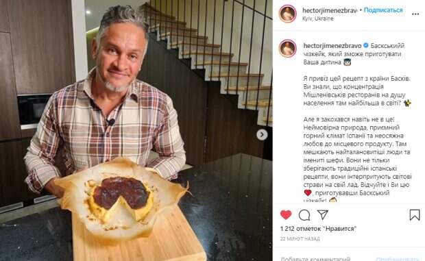 Вы знали, что концентрация мишленовских ресторанов на душу населения там самая большая в мире? Но я влюбился даже не в это! Невероятная природа, приятный горный климат Испании и необъятная любовь к местному продукту. Там живут самые талантливые люди и именитые шефы. Они не только хранят традиционные испанские рецепты, они интерпретируют мировые блюда на свой лад", - эмоционально высказал Эктор под постом. Для приготовления вам понадобится: Сливочный сыр (Филадельфия) - 250 гр. Мука-5 гр. Яйцо-1 шт. Желток - 1 шт. Сливки 30% - 150 гр. Сахар-60 гр. А вот способ приготовления оказался действительно очень простым: вам нужно смешать все ингредиенты до однородной массы и полного растворения сахара. Поместив массу у форму для выпечки, выпекать в духовке при 220 градусов - 30 минут. Напомним, что Хименес-Браво раскрыл хитрости приготовления крем-супа:"он станет вашим фаворитом". А еще Politeka писала, что Хименес-Браво удивил рецептом нежнейшего десерта с ежевикой: "Фокус В...". Также Politeka сообщала, что Хименес-Браво раскрыл рецепты вкусных закусок:"Наслаждайтесь".
