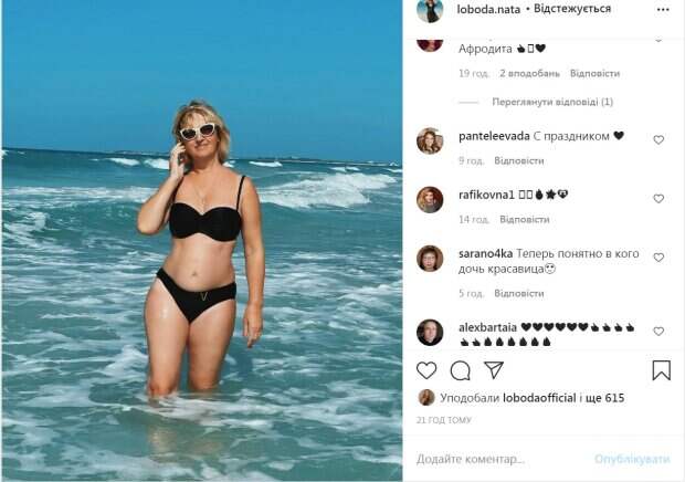 На глазах у нее солнцезащитные очки в белой оправе. В свои 63 года женщина может похвастаться прекрасной фигурой, у нее роскошный бюст, тонкая талия и длинные ноги. Не удивительно, что после фото в купальнике Наталью Лободу буквально засыпали комплиментами. «Богиня», «Ну просто, отвал всего», «Какая вы классная!!», «Шикарная», «Фигура огонь», «Вау. Модель. Так держать», «Теперь понятно в кого дочь красавица», «Это что за Афродита», «Изумительная», - восхищаются пользователи Сети. Лайк публикации поставила и Светлана Лобода. Также она сделала репост фотографии у себя в "Сторис". Как известно, Светлана Лобода с мамой и сестрой отдыхают в ОАЭ. Там и было сделано данное фото. Отметим, певицы покинула родных раньше, и уже отправилась работать. А ее семья продолжит наслаждаться солнцем и морем. Напомним, что довольная Светлана Лобода сразила наповал видом в «колючем» мини-платье: «Как елочка». Как сообщала Politeka, роскошная Лобода стала невестой, неожиданное видео: "С замиранием сердца...". Также Politeka писала, что кудрявая Лобода произвела фурор новым образом, устоять невозможно: «Держи меня крепче…»