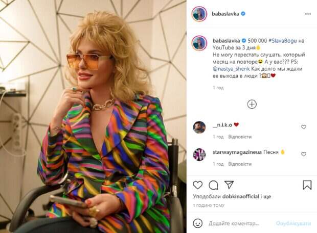 Артистка ранее представила первый трек в роли сольной звезды, а несколько дней назад состоялась премьера ее нового яркого клипа "Слава Богу", в котором поклонники увидели совершенно новую Славу. В своем микроблоге в Instagram Каминская опубликовала необычное фото в интересном образе, а в подписи к нему поблагодарила фанатов за просмотры ее нового клипа. На снимке артистка запечатлена где-то в закулисье съемок, перед камерой она появилась в образе из клипа, но фанаты отметили, что она похожа на Ирину Аллегрову. На ней яркий пестрый пиджак и темные брюк, на голове пышная прическа в стиле восьмидесятых, а на глазах огромные солнцезащитные очки, она не смотрит в камеру. В подписи к публикации Каминская написала: "500 000 #SlavaBogu на YouTube за 3 дня. Не могу перестать слушать, который месяц на повторе. А у вас??? PS: @nastya_shenk Как долго мы ждали ее выхода в люди?". Пользователи тут же принялись активно обсуждать новое фото звезды и ее новый яркий клип. "На повторе по 100 раз", "На Аллегрову похожа", "Бомба ракета", "Я под эту песню делаю все", "Реально хит", "Отличная песня и клип", "Каждый день слушаю по несколько раз", "Красотка", - пишут фанаты. Напомним, Каминская в коже козырнула прелестями, показав, что будет делать после распада «НеАнгелов»: "Ты же мать! ". Как сообщала Politeka, Слава Каминская из "НеАнгелов" решилась показать лицо после пластики без макияжа: "Вот уже 13 лет...". Также Politeka писала, Похудевшая Каминская показала новую себя, с "НеАнгелами" покончено навсегда: "С премьерой!".
