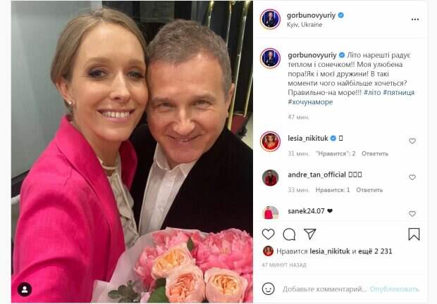 Так, Горбунов разместил яркое селфи с супругой. Последняя позировала в розовом жакете и держала в руках букет красивых цветов. Завершили ее образ аккуратные серьги и макияж с акцентом на глаза. Супруги прижались друг к другу и улыбались. "Лето наконец радует теплом и солнышком!! Моя любимая пора! Как и у моей жены! В такие моменты чего больше всего хочется? Правильно - на море !!! # Лето # пятница # хочунаморе", - написал артист, обрадовавшись долгожданному теплу. За 40 минут публикация собрала более 2000 лайков и много комментариев. "Красивые)", "В Днепре колотун уже который день", "Прекрасно выглядите. Такие счастливые и красивые вместе", "А на море холодно", - написали пользователи сети. Напомним, Катя Осадчая и Юрий Горбунов были много лет знакомы, но симпатия появилась во время шоу "Голос. Діти", которую они вели. В перерывах между съемками оба созванивались и ходили на ужины, и в итоге они стали встречаться. Примечательно, что у Осадчей есть 18-летний Илья Полищук, которого она родила в первом браке. Напомним, беременная Осадчая поразила кадрами без фильтров, расслабившись на яхте: "Каникулы заканчиваются, но...". Как сообщала Politeka, беременная Осадчая растерялась, говоря о маме, трогательное видео: "Она самая. ..". Также Politeka писала, Горбунов заснял трогательный момент с беременной Осадчей и сыном: "Ждем пополнения...".