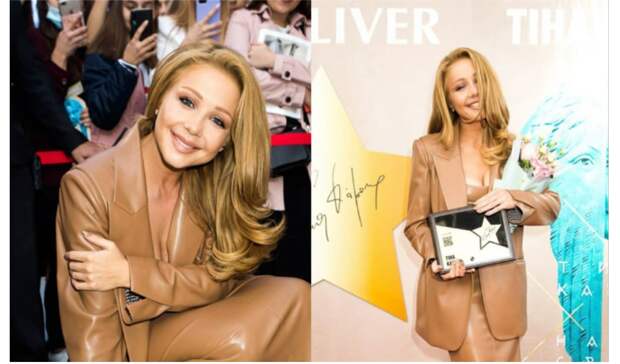 В[caption id="attachment_75190" align="aligncenter" width="620"] Тина Кароль принимает награду[/caption]В комплекте облегающее латексное платье и длинный пиджак, дополнен образ бежевыми туфлями на шпильке. По традиции, Тина устроила фотосессию у своей звезды.Вот как это происходило. сказала:Заслуга, что эта звезда здесь — заслуга моей семьи, команды и самое главное, фан-клуба "ФанТина"! Если не было бы вас, у меня не было бы смысла. Почему, зачем, для кого? Это для вас. В этом моя главная цель — вдохновлятьМы присоединяемся к подздавлениям коллег, друзей и поклонников Тины Кароль - она давно заслужила иметь такое отличие.