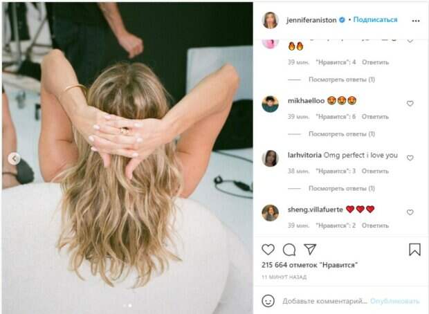 В этот раз Дженнифер показала, что она по-прежнему в отличной физической форме не только благодаря регулярным тренировкам. Позируя в черном платье спиной к объективу, Энистом подчеркнула, что грядет впереди что-то интересное и она успела принять участие в очередной интригующей сьемке: «Что-то приближается