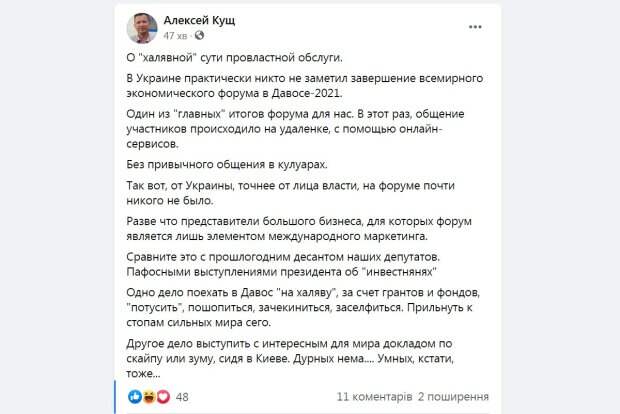 В Украине практически никто не заметил завершение всемирного экономического форума в Давосе-2021 Об этом на своей странице в Facebook рассказал экономист Алексей Кущ. Далее приводим его слова без изменений. Один из "главных" итогов форума для нас. В этот раз, общение участников происходило на удаленке, с помощью онлайн-сервисов.