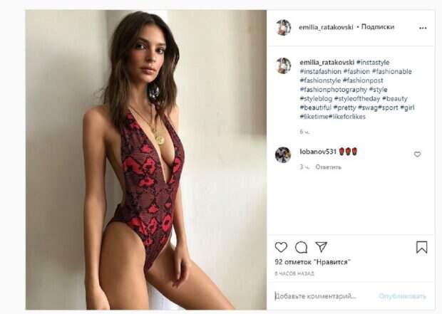 Кадр получился очень соблазнительным и пикантным. Об этом пишет Politeka.net со ссылкой на страничку знаменитости. Фанаты не ставили лайки и не писали комментарии, но так и хочется добавить: "Дикая кошка, вот это ягодки". Сообщалось, что американская модель из Victoria’s Secret и начинающая актриса Эмили Ратаковски вывалила бюст в купальнике. В этот раз красотка предстала в купальнике, из которого едва ли не выпрыгивала грудь. Модель надела черный купальник на завязках с откровенным декольте. Красивая грудь звезды едва ли не выпрыгивала и не показывалась во всей красе. Взгляд приманивала именно это пикантная деталь, а также стройная талия. Мы писали, что супермодель Эмили Ратаковски посветила своими упругими прелестями в полном неглиже. Эмилия запечатлена полностью голая, ее кожу покрывает лишь боди арт в виде чешуйчатого купальника. Судя по густым джунглям на фоне, в такой жаркой обстановке одежда только мешает наслаждаться отдыхом. Напомним, Ратаковски не смогла скрыть всю красоту за ниточками бикини А еще Politeka писала, что Эмили Ратаковски заманчиво сжала бюст в прозрачном лифчике Также Politeka сообщала, что Эмили Ратаковски поразила преображением из домашней "мышки" в королеву красных дорожек