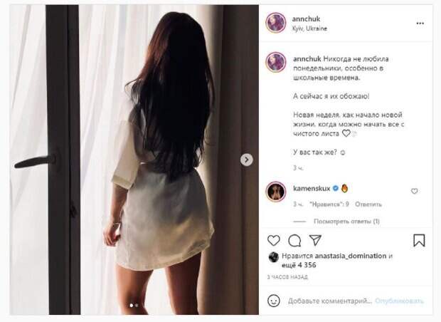Также красотка ведет страничку в социальной сети Инстаграм, где делиться с многочисленной армией фанатов интересным контентом. В этот раз Анна опубликовала фото, на котором позировала в блузе и без штанов. Красотка стояла у окна, развернувшись спиной и демонстрируя не только роскошные ножки, но и волосы, которые дотягивались почти до пояса. "Никогда не любила понедельники, особенно в школьные времена. А сейчас я их обожаю! Новая неделя, как начало новой жизни, когда можно начать все с чистого листа", - написала звезда под фото. Настя сразу прокомментировала публикацию подруги: "Огонь". Фанаты поставили более 4 тысяч лайков и написали комментарии: "Я тоже обожаю понедельники, особенно те с которых ты отказываешься на месяц без сахара", "Такая же история", "Очень красивая, обожаю", "Я тоже люблю понедельник, у меня почти ввсегда выходной". Напомним, лучшая подруга Каменских после развода с Позитивом похвасталась новой прической Также Politeka писала, что лучшая подруга Каменских в красном бикини впечатлила даже Потапа А еще Politeka сообщала, что экс-жена Позитива в платье с разрезом и ботфортах показала, что потерял рэпер