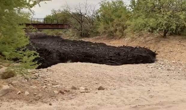 Очевидцы из округа Пима в штате Аризона (США) записали на видео движение потока черного шлама по пересохшему руслу реки. Зловещая черная субстанция затопила окрестности местечка Каньяда-дель-Оро Уош и угрожает всей округе. Все это происходит на фоне масштабного лесного пожара «Bighorn Fire», который не могут потушить с 5 июня 2020-го.