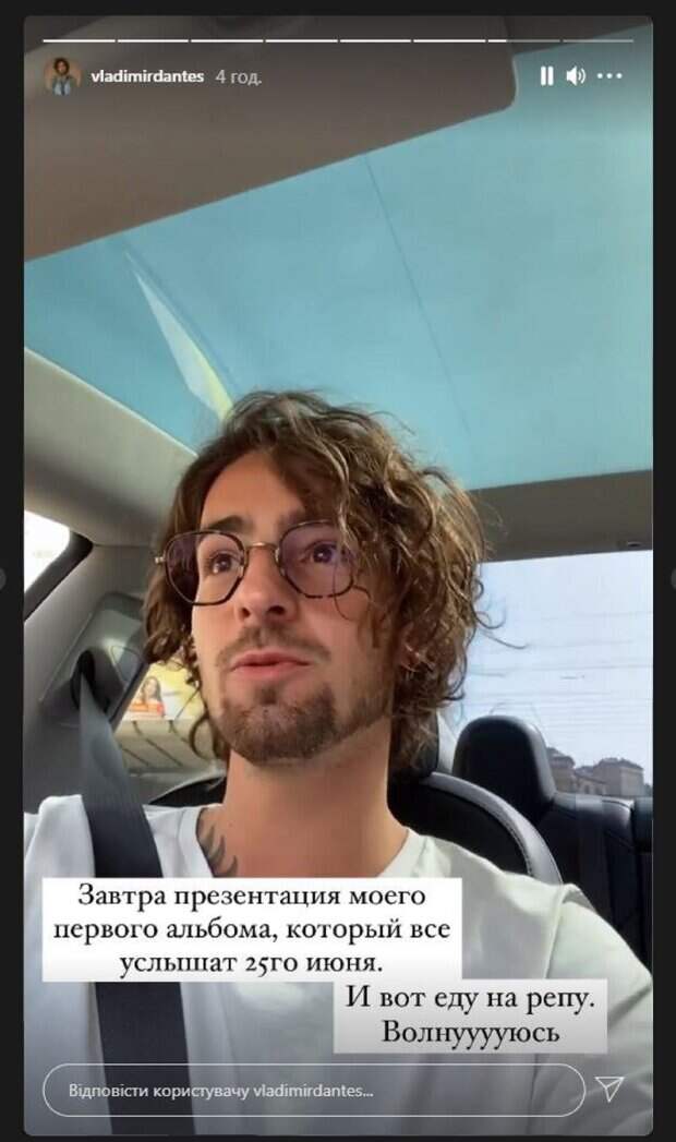И вот, спустя 2 года, певец записал первый альбом и презентует его 22 июня, а услышат его все уже 25 июня. "Доброе утро, короче, ребят, завтра у меня очень важное событие - презентация моего первого альбома. Сейчас еду на репетицию, потом на спорт, ну чтобы чуть подтянутей быть", - сказал Дантес, пока рулил автомобилем. На видео Владимир был в белой футболке и стильных очках. "Завтра презентация моего первого альбома, который все услышат 25-го июня. И вот еду на репетицию. Волнуюсь", - написал под кадрами Дантес. Сообщалось, что известный украинский певец и муж Нади Дорофеевой Владимир Дантес насмешил неловким домашним видом. В этот раз певец насмешил домашним кадром в растянутой кофте, простом свитере и брюках. Максимально простой образ Дантес выбрал, чтобы показать «живой» кадр. Напомним, Дантес засветил их с Дорофеевой гардеробную, обуви как в магазине А еще Politeka писала, что Дантес прямо в луже закатил истерику, Дорофеевой не позавидуешь Также Politeka сообщала, что Надя Дорофеева в трусах и с бокалом открыла сезон загара