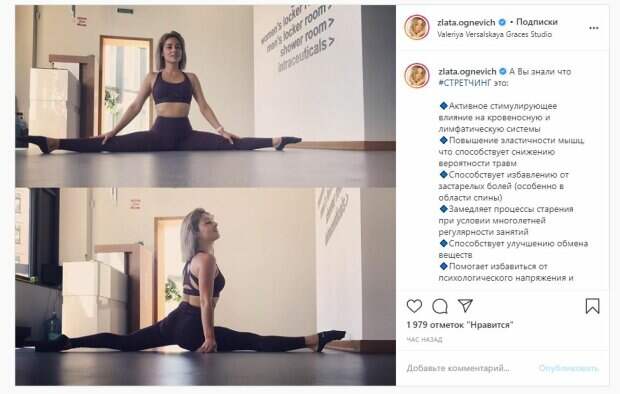 Об этом пишет Politeka.net со ссылкой на страничку знаменитости. "Всем здоровья! А я пойду выпью грейпфрутовый фреш после тренировки в супер-студии", - написала Злата. Фанаты поставили почти 2 тысячи лайков и написали комментарии: "Ну ничего себе", "Злата, ты красавица", "Молодец, круто тренируешься. И твой шпагат супер, невероятно просто", "А ещё полезно тянуться расставив руки вверх и в сторону по 1~ 2 минуты по 2- 3 раза в день...", "Зачет", "Ты просто бомба, ракета". Сообщалось, что известная украинская певица Злата Огневич похвасталась фигурой в платье в золотых тонах. Так, Злата была в платье на тонких бретельках, которое подчеркнуло ее формы. Девушка присела на стул и ярко улыбалась. Ее образ завершали серьги и множество колец на пальцах. Огневич выглядела ярко и свежо. Ранее мы сообщали, что известная украинская певица Злата Огневич показала свое умение в гимнастических лентах. На фото Злата позировала в красном комбинезоне, у которого была открыта спина. Огневич собрала волосы в хвост, чтобы не мешали, а сама парила а воздухе среди гимнастических лент. Напомним, Злата Огневич в кружевном белье без капли стыда показала свою женскую силу А еще Politeka писала, что Злата Огневич выставила свои "ягодки" в красном белье Также Politeka сообщала, что горячая Злата Огневич пленила страстным образом в кружевах