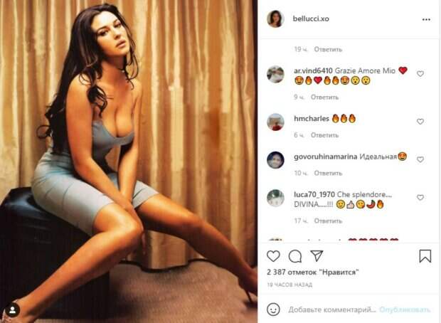 Фанаты же с радостью вспоминают лучшие наряды Моники, которая прославилась благодаря яркой внешности и темпераметной игре в фильмах. Не так давно поклонники поделились пикантным ардивным снимком с Беллуччи. Позируя в нежно-бирюзовом платье на тонких бретельках, звезда превзошла саму себя. Ей достаточно было наклониться, чтобы захватить все внимание открытым декольте: «Шикарная Беллуччи; Оу, не слишком ли хот