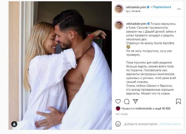Как известно, Квиткова сейчас находится в интересном положении и семейство ждет пополнение. Об этом пишет Politeka.net со ссылкой на страничку знаменитости. "Только вернулись в Киев. Самолёт приземлился, заехали мы с Дашей домой, затем я успел провести концерт и решить несколько дел. Отдохнул по-всему после прилёта. Но не могу по-другому, кучу раз проверял", - написал Никита под фото. Фанаты поставили более 16 тысяч лайков и написали комментарии: "Крассавица и крассавчик.... Умнички, рада за вас", "Хорошая семья", "Такие милые", "Такие красивые и счастливые". Мы писали, что звезда Холостяка, победительница шоу Даша Квиткова показала, как поправилась за время беременности. “Перестала взвешиваться, так как уже тяжело держать тело на ногах, то ли еще будет… По ощущениям, я вешу 80 кг уже… При этом на еду я не налегаю – просто ем три раза в день", - рассказала Даша. Напомним, "Холостяк" Добрынин вызвал бурю эмоций пикантным фото с беременной женой на отдыхе А еще Politeka писала, что беременная жена "Холостяка" Добрынина выставила напоказ постельное фото с мужем Также Politeka сообщала, что беременная жена "Холостяка" Добрынина поразила кадрами без лифчика и в расстегнутых штанах