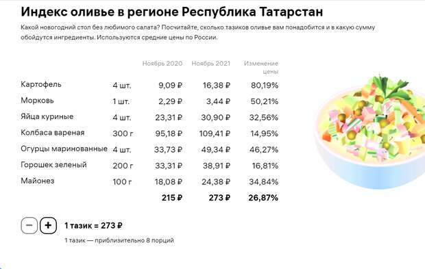 В Татарстане цены на ингредиенты для салата оливье за год выросли на 26,9%. Об этом следует из данных информационно-просветительского ресурса Банка России Fincult. Так, жителям республики на приготовление «тазика оливье» на 8 порций придется потратить 273 рубля, тогда как год назад — 215 рублей. Фото: скриншот Больше всего из ингредиентов подорожал картофель — он стал стоит 16,38 рублей за 4 штуки.