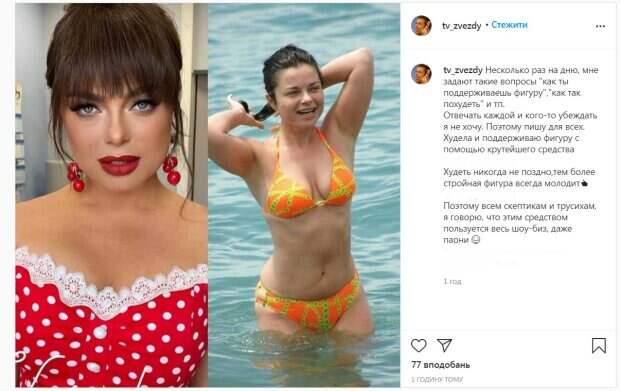 В фотографии привлекает внимание, что фигура артистки находится не в лучшей форме. Ее кожа выглядит немного дряблой. Кроме того, видны и пару лишних килограммов. "Худеть никогда не поздно,тем более стройная фигура всегда молодит", - сказано в подписи к фото. Можно заметитить, что вид певицы на этом очень отличается от того, в каком виде она появлется к примеру в своих в клипах. В реальной жизни безх тонн макияжа артистку можно и не узнать. Кпримеру свою песню "Красная помада" Королева преентовала в ярком образе, который делает ее моложе. Отметим, ранее Королева признавалась, что за ее фигурой следит супруг Сергей Глушко. Сам он много лет старается вести здоровый образ жизни и приучает к нему саму Наташу. Королева призналась, что Тарзан запрещает ей есть вредные для организма продукты и тщательно следит за содержимым холодильника. Однако похоже, на фоне недавних скандалом с изменами ему было не до того. Напомним, Наташа Королева разрыдалась в объятиях Тарзана после скандала с изменами: "Столько боли и позора принес...". Как сообщала Politeka, опухшего Тарзана едва узнали после возвращения из Африки, удаленное фото. Также Politeka писала, что плачущие Королева и Тарзан поразили кадрами примирения, о скандале можно забыть.