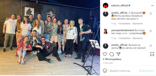 Сам MELOVIN выглядел довольно странно и сидел у ног друзей. Он был одет в черные широкие штаны и бордовую накидку. Его лицо прикрывали солнцезащитные очки, а на голове красовалась малиновая шапка. «Дружище, пусть все мечты сбываются!», - подписал фото артист. В комментариях поклонники певца оставили ему массу приятных слов. «Какой у тебя интересный прикид», «Мэл, срочно нужно фото, где ты поближе. А то тебя такого стильного не могу рассмотреть. Твоему другу привет!», «Хорошо когда есть друзья», «С Днюшкой. Мечты должны сбываться, ведь мечтать так круто!», «Все люди как люди, а ты – суперзвезда», «Луки – кайф!», - пишут пользователи сети. Ранее мы писали, что MELOVIN, более известный как Константин Бочаров, вернулся к концертной деятельности после перерыва, вызванного пандемией. Фото в дерзком образе после концерта во Львове артист показал в своем Instagram. Напомним, что фаворит Андрея Данилко выдал горькую правду об украинском шоубизе: "Есть люди, которые...". Как сообщала Politeka, любимец Данилко MELOVIN с расстроенным видом и таблетками показал свое утро: "Не такое оно и доброе". Также Politeka писала, что фаворит Данилко MELOVIN рассекретил общие планы с Тиной Кароль на июль: "Готовьте огнетушители".