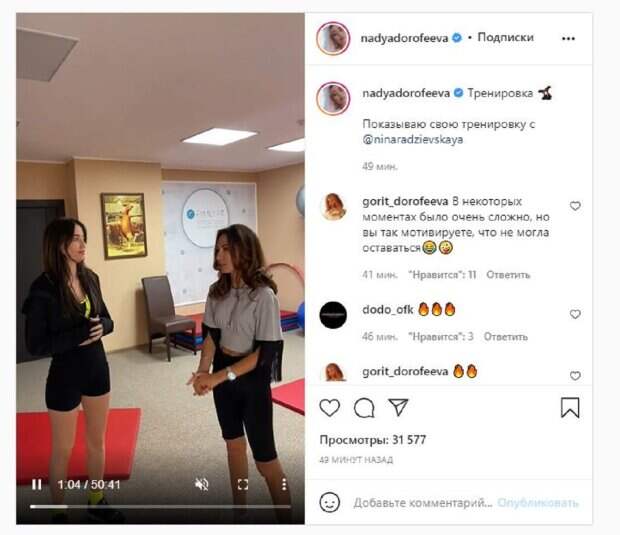 Сегодня певица в Инстаграм похвасталась, что получила золотую кнопку от Ютуб за миллион подписчиков. Теперь Надя показала в Инстаграм, как провела тренировку с подружкой Ниной. Дорофеева была в топике и узких шортиках. "Привет ребята, привет всем. Мы конечно же подождем пока Инстаграм будет включаться. Обычно он включается секунд, кажется, 30. Всем привет еще раз, ребят. Спасибо всем, кто там присоединился в прямой эфир. Рядом со мной стоит прекрасная Нина Радзиевская, с которой я треню с момента карантина", - поздоровалась Надя и рассказала о своем тренере. "Тренировка. Показывают свою тренировку с Надей", - написала Дорофеева. Фанаты посмотрели видео десятки тысяч раз и написали комментарии: "В некоторых моментах было очень сложно, но вы так мотивируете, что не могла оставаться", "Это просто огонь", "Девочки вы такие молодцы. Делала вместе с вами, было очень полезно!". Напомним, Дорофеева изумила видом, надев рубашку под необычное платье А еще Politeka сообщала, что Надя Дорофеева в кислотных мини-шортах игриво показала, как привлечь внимание Также Politeka писала, что Дантес признался, почему он в долгу перед Дорофеевой