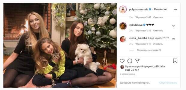 Известная певица Оля Полякова показала себя и дочерей На фото Оля сидит в платье и колготах. Рядом можно увидеть младшую дочь Алису, которая в руках держит кота. Возле нее уже расположилась Маша, у которой удобно устроилась собака. Красотки улыбались, позируя у камина с елкой. Благодаря этому фото получилось семейным и праздничным.