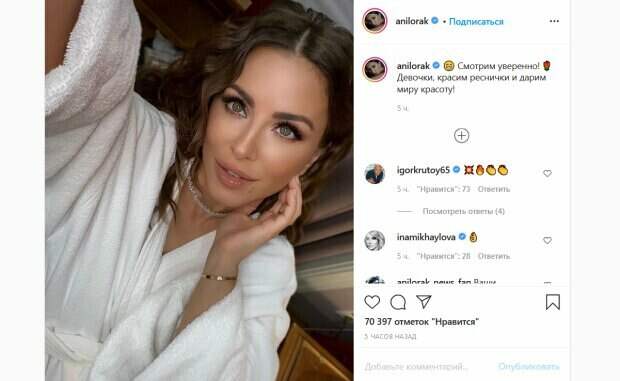После этого все вместе красотки смеются на камеру. «Роскошная и неповторимая! Золотая россыпь красоты», «кайф. Даже с вами захотелось потанцевать», «молодые и ничего не болит. Вся жизнь впереди», «красотка», «смотря на вас, есть чему подражать. Очень крутая», - пишут ее поклонники. Как сообщалось ранее, украинская певица Ани Лорак похвасталась пышными ресницами, засветившись перед камерой в одном халате Певица решила сфотографировать себя дома, показав, как выглядит не на гламурных мероприятиях, а в обычной жизни. При этом, на ее лице красовался тщательно продуманный макияж. Особое внимание привлекают к себе пышные ресницы красотки. А вот с одеждой Лорак решила не заморачиваться и предстала перед зрителями в одном банном халате. Напомним, похудевшая Ани Лорак едва втиснула бюст в узкое платье и ошеломила видом на тайных съемках. Как сообщала Politeka, Ани Лорак свела Киркорова с ума роскошным образом, Бузова устроила сцену ревности. Также Politeka писала, что Ани Лорак в экстра-мини повертела прелестями перед Максом Барских: «Такие приятные…».