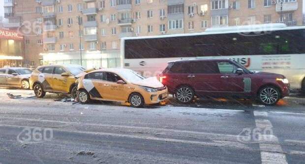 Такси KIA, автомобили Range Rover и Haval столкнулись у дома № 7 на улице Большая Дорогомиловская в Западном административном округе Москвы. Причиной аварии стала бутылка воды, попавшая под педаль одного из автомобилей. Пострадали два человека, сообщил источник «360».