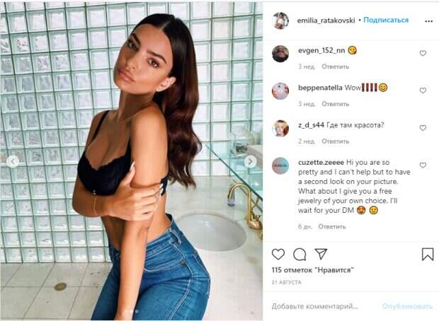 Не так давно Эмили на своих селфи удалось подчеркнуть естественную красоту. С минимумом макияжа, без блузки и в синих джинсах с высокой талией модель выглядела очень соблазнительно. При этом Эмили показала грудь в кружевах с удачного ракурса, позируя рядом с ванной: «