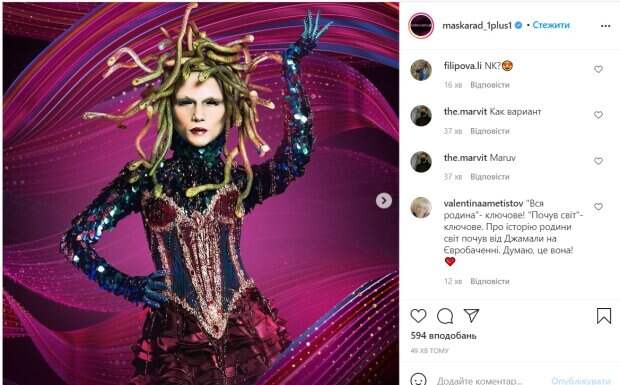 В описаниях к постам организаторы "Маскарада" всегда дают определенные подсказки, кто же может прятаться под тем или иным костюмом. Так, пятой героиней шоу стала одна из самых известных персонажей мифов – Медуза Горгона. По легенде, это была дочь бога моря, которую превратили в чудовище со змеями на голове вместо волос. "История фантастической героини не менее интересна, чем ее костюм. Легенда проекта гласит, что родственники Горгоны прожили интересную жизнь. Сама же Медуза - стала символом свободы и справедливости на родине, и ее услышал весь мир", - так описывают создатели шоу, того, кто скрывается под этим костюмом. В комментариях к публикации фанаты шоу высказали свои догадки. "Я думаю, что это Джамала", "Maruv", "Лида ли, ее фирменная поза", "Джамала", "Тина?", "Вся семья"- ключевое! "Услышал мир" - ключевое. Об истории семьи мир услышал от Джамалы на Евровидении. Думаю, это она! ❤️ ", "Певица Алеша?", - пишут в сети. Как видим, образ Горгоны-невероятный. По словам организаторов, на его создание ушло более 5 килограммов бисера. Ранее Politeka писала, что новый участник "Танцев со звездами" появился в нетрезвом виде: "Именно тот случай" Напомним, что Джамала, став участницей "Танцы со звездами", показалась в экстравагантном наряде перед публикой: "Вы невероятная" A еще Politeka сообщала, что у участников шоу " Танцы со звездами "появилась серьезная конкурентка:" пошли известные звезды. ..".