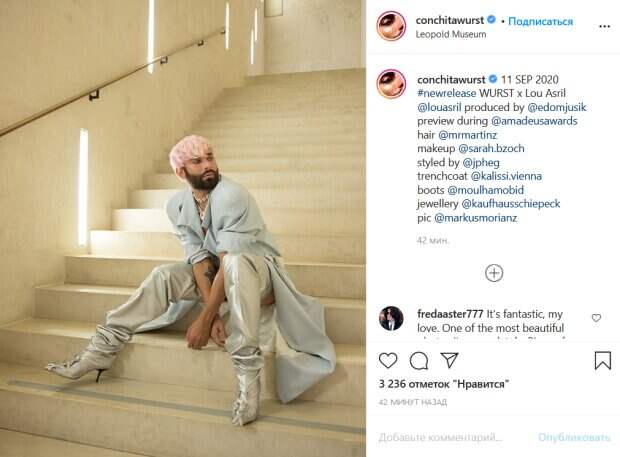 На нем оригинальный наряд в виде длинного голубого плаща, подол которого живописно лежит на ступеньках, и до неприличия высоких серебристых сапог на высокой шпильке. Образ певца дополняют массивные украшения на шее и нежно-розовые волосы, которые весьма оригинально сочетаются с его фирменной черной бородой. Артист выглядит как настоящая дива. Поклонники артиста не могли остаться в стороне и буквально засыпали певца комплиментами. Ранее мы писали, что Нойвирт заинтриговал публику свежим фото, заставив умирать от ожидания. Артист опубликовал новый снимок в своем микроблоге в Инстаграм, на котором предстал в полуголом виде с "кукольным" красавчиком. Кончита оголила плечи, приспустив "пушистую" серую кофту и прильнула к патрнеру по фотосъемке в розовом вязаном свитере. Оба стильных "бородача" козырнули необычным цветом волос. Вурст перекрасилась из блондинки в розовый. Кроме того, звезда и ее товарищ украсили уши массивными серьгами. Напомним, звезда "Евровидения" Кончита Вурст внезапно изменила имидж: "Ого, наконец вернулась...". Как сообщала Politeka, звезда "Евровидения" Кончита Вурст без стыда и одежды похвасталась волосато-загорелым телом: слишком жарко. Также Politeka писала, что победительница "Евровидения" Кончита Вурст оголила грудь ради дерзкого фото: "настоящая звезда".