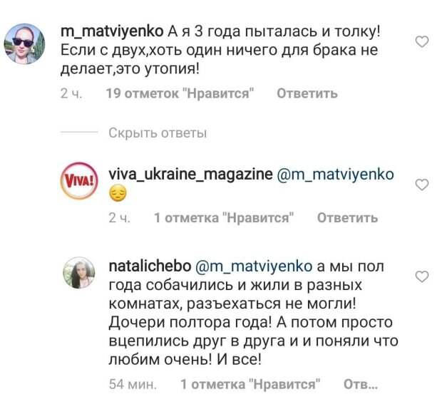 В своем обращении к людям, которые переживают похожую ситуацию и обречены встретить День святого Валентина в одиночестве, телеведущая напомнила, что после расставания жизнь не заканчивается и терять веру в счастье ни в коему случае нельзя. «Так задумано, я знаю. Если вы остались одни с разбитым сердцем и душой, помните, рядом с вами ваши друзья и близкие. Их поддержка помогает в такие моменты», - говорит Витвицкая. Звезда телеканала «1+1» призналась, что год пыталась спасти свой брак с Владом Кочатковым и надеялась, что все еще можно исправить, и они будут счастливы. Супруги вместе посещали семейного психолога, однако это не помогло. Соломия Витвицкая уточнила, что решение о разводе они с Владом приняли вместе, оно было взвешенное и сознательное. «Решение далось нам тяжело, но сейчас мы уже спокойны», - призналась ведущая ТСН. Говоря об их с Владом отношениях в настоящий момент, Витвицкая уверяет, что они остались близкими людьми, между которыми царит взаимоуважение и любовь. «Мы любим друг друга по-своему», - сказала Витвицкая. О новых отношениях, по словам Витвицкой, она еще не думает, но верит, что в будущем встретит свою любовь. В свою очередь украинцы в соцсетях сожалеют, что брак Витвицкой с Кочатковым распался и делятся своими историями. «А я три года пыталась и толку! Если из двух хоть один ничего для брака не делает, это утопия!», «Мы полгода собачились и жили в разных комнатах, разъехаться не могли! Дочери полтора года! А потом просто вцепились в друг друга и поняли, что любим очень. И все!», - пишут пользователи Инстаграм. Напомним, на днях Соломия Витвицкая призналась, что ее брак с Владиславом Кочатковым распался. Как сообщала Politeka, Соломия Витвицкая год скрывала проблемы в семье, а Новый Год встречала уже свободной женщиной Также Politeka писала, что Лидия Таран, Алла Мазур, Маричка Падалко и другие звезды "1+1" поразили внешностью вне эфира