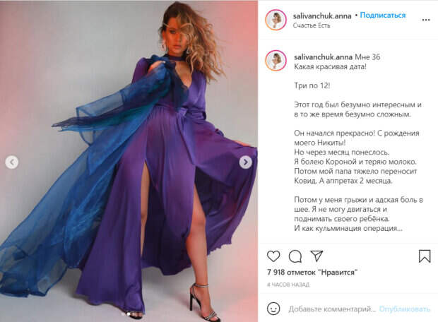На этот раз девушка поделилась новой фотографией на своей странице в Инстаграм. На снимке Анна в шикарном фиолетовом платье с глубоким вырезом, который показывает идеальные формы девушки. Также платье имеет разрез, который открывает вид на длинные ноги актрисы. Акриса раскрыла, что празднует день рождения, ей 35 лет. Она решила заговорить о том, с какими сложностями она столкнулась за этот год. "Он начался прекрасно! С рождения моего Никиты! Но через месяц понеслось. Я болею Короной и теряю молоко. Потом мой папа тяжело переносит Ковид. А аппретах 2 месяца. ⠀ Потом у меня грыжи и адская боль в шее. Я не могу двигаться и поднимать своего ребёнка. И как кульминация операция… ⠀ После неё наконец-то первые лучики среди туч. Я пыталась держаться бодрячком. Пыталась ловить от жизни кайф и никогда не теряла надежду в то, что завтра будет лучше. ⠀ Но даже не смотря на это было оооочень сложно. Эти 2 месяца в корсете вспоминать без слез не возможно. Я даже ещё не успела прийти в форму после всего этого, потому что кайф получала только от еды