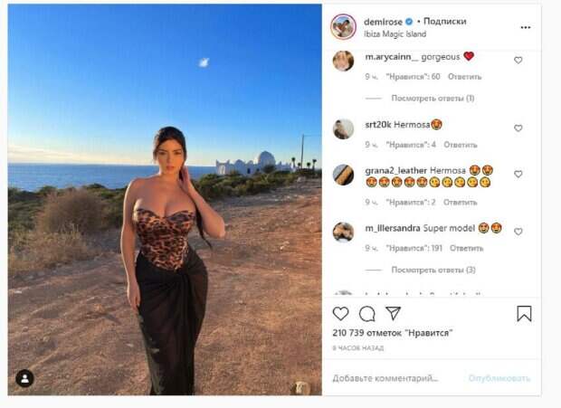 Известная модель Деми Роуз показала себя на прогулке по Ибице На фото красотка позировала в накидке черного цвета, которую использовала вместо платья. Деми дополнила образ леопардовым боди, которое не смогло спрятать пышный бюст девушки, который прямо вырывался на свободу. Звезда стояла на грунтовой дороге у моря, хвастаясь видами острова Ибица, где сейчас отдыхает.