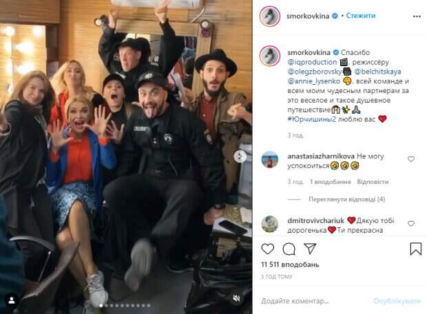 Актерский коллектив, включая гримеров, костюмеров и прочих сделали на прощание "живое" фото: хаотично и забавно двигаясь, создавая единый сумасшедший "ансамбль". В кадре, в том числе, засветилась и актриса Ольга Сумская, присоединившаяся к "Юрчишиным" в этом сезоне. 54-летняя звезда делала непонятные движения руками, широко открыв рот, - создалось впечатление, что она дрыгается. "Спасибо всей команде и всем моим чудесным партнерам за это веселое и такое душевное путешествие