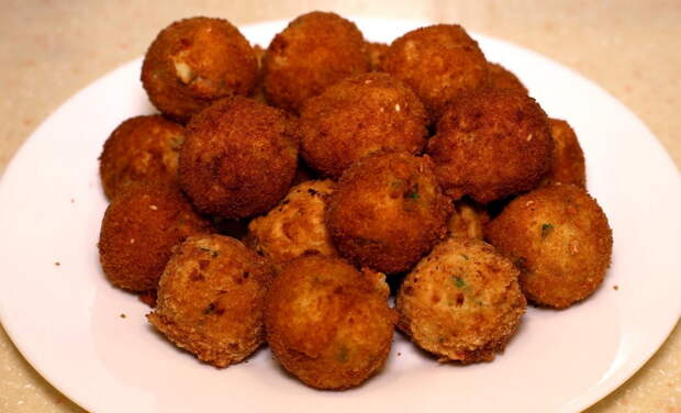 Сыр натереть на терке, зелень измельчить. Картофельное пюре соединить с беконом и луком. Добавить зелень, специи, сыр и одно яйцо. Перемешать. Затем из картофельной массы сформовать пончики, убрать в холодильник на 30 минут. Яйца взбить, растительное масло разогреть в кастрюлю. Каждый картофельный пончик обвалять сначала в муке, затем в яичной смеси и панировочных сухарях. Жарить до золотистой корочки. Пончики должны «плавать» в масле. Готовые пончики выложить на бумажную салфетку, которая впитает лишнее масло.[embed][/embed]