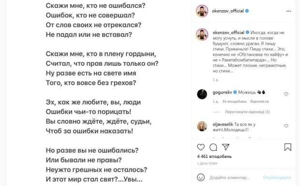 Я пишу стихи. Прикиньте! Пишу стихи… Это, конечно не «Обстановка по кайфу» и не «Ракетабомбапитарда»… Но стихи… Может плохие, неграмотные, но стихи…» - отметил певец. В своем стихе он говорит об ошибках, отмечая, что они свойственны каждому. «Разве вы не ошибались?» - обращается он к публике. Фолловеры активно отреагировали на такое послание. «Очень круто. Ты талантище», «Очень душевно», «Вот нагрешил», «Все, как в жизни. Молодец», - пишут в комментариях. Напомним, во время концерта в Бердянске в конце июля Олег Кензов позволял себе нецензурную лексику, неудачно жонглировал микрофоном и лежал на сцене. Напомним, появилось видео с "пьяного" концерта Олега Кензова: "Многие изменят к нему отношение" Как сообщала Politeka, победительница "Холостяка" Ульянова раскрыла правду об отношениях с Олегом Кензовым: "У нас с ним..." Также Politeka писала, что Олег Кензов вызвал отвращение своим поведением на сцене, видео: "Пьяный угар и мат"