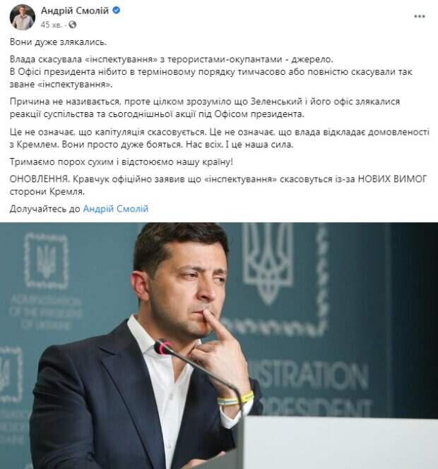 В офисе президента якобы в срочном порядке временно или полностью отменили так называемое "инспектирование". Причина не называется, однако вполне понятно, что Зеленский и его офис испугались реакции общества и сегодняшней акции под Офисом президента", - написал эксперт. При этом он подчеркнул, что это вовсе не означает, что капитуляция Украины на Донбассе отменяется. "Это не значит, что власть откладывает договоренности с Кремлем. Они просто очень боятся. Нас всех. И это наша сила. Держим порох сухим и отстаиваем нашу страну!"- призывал Смолий. Впоследствии эксперт добавил, что представитель Украины в ТКГ по Донбассу Леонид Кравчук уже заявил, что "совместное инспектирование" все же полностью отменяется. Объясняется это тем, что Кремль выдвинул новые требования. Какие именно - пока не сообщается. Как известно, о "совместном инспектировании" позиций ВСУ в районе Шумов было объявлено в среду, 9 сентября. Такое решение вызвало бурную реакцию среди общества и украинский военных. Напомним, ВСУ будут патрулировать Донбасс вместе с оккупантами: новое решение ТКГ возмутило украинцев. Как сообщала Politeka, командир морпехов ВСУ обратился к украинцам из-за инспекции "ДНР" на Донбассе: "Готовы сокрушить врага". Также Politeka писала, что на Донбассе оборвалась жизнь защитника Украины: известны подробности трагедии.