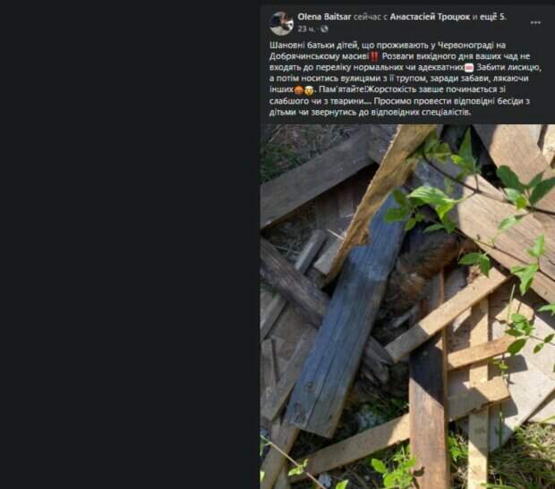 На Львовщине дети поразили диким поступком Как передает Politeka.net, тревогу забили местные жители в сети. Инцидент произошел в Краснограде. По словам зоозащитницы, дети забили лису, а потом носили ее тело по улицам ради забавы, чем пугали других людей. "Помните! Жестокость всегда начинается со слабого или с животного .