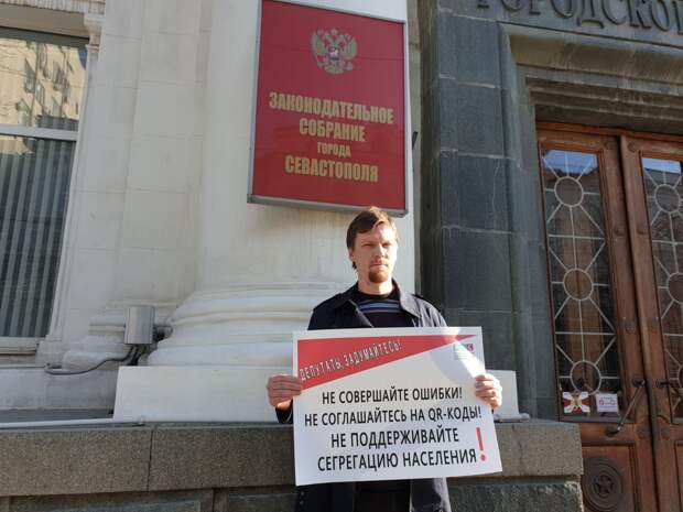 «Я вышел на акцию протеста против принятия законопроектов о введении QR-кодов. Я считаю, что это не спасает от коронавируса, а только разделяет население», — заявил активист. Он обратил внимание на то, что сегодня здоровые люди, сомневающиеся в эффективности вакцины от COVID-19 и не желающие прививаться, вынуждены постоянно доказывать, что они не опасны для общества. «Впервые здоровые люди становятся, как „чумные“, то есть проблемным считается здоровый человек, а не больной», — рассказал молодой человек. Он напомнил слова сотрудника регионального Роспотребнадзора Республики Хакасия о том, что привитые распространяют вирус больше, чем непривитые, и являются основными разносчиками инфекции, а не наоборот. «QR-коды — это только разделение людей и создание социальной напряженности в государстве», — убежден участник пикета. Напомним, что с 15 октября в Севастополе указом губернатора Михаила Развожаева введен режим QR-кодов. Он распространяется на посещение заведений общепита, спортзала, салонов красоты, МФЦ, а также учреждений культуры, включая театры, кинотеатры, музеи, библиотеки, концертные залы. Невакцинированных граждан также перестали пускать в учреждения дополнительного образования — родители вынуждены ждать своих детей на улице, пока те занимаются. Несогласные с принятыми ограничениями жители Севастополя записали несколько видеообращений к президенту страны Владимиру Путину с требованием не допустить сегрегацию и дискриминацию граждан России по принципу наличия или отсутствия QR-кода. Горожане также выходят к административным зданиям с одиночными пикетами против введения QR-кодов и принудительной вакцинации. Напомним также, 12 ноября правительство РФ внесло в Госдуму два законопроекта об обязательном использовании QR-кодов в общественных местах и на транспорте. Первый законопроект предполагает, что граждане смогут посещать места массовых мероприятий, культурные учреждения, объекты общепита и розничной торговли с предъявлением либо QR-кода о вакцинации, либо документа, подтверждающего, что человек переболел коронавирусом, либо медотвода от вакцинации. Второй документ предлагает ввести QR-коды на железнодорожном и авиационном транспорте для междугородных и международных перевозок. Новость о внесении законопроектов вызвала волну протестов по всей России. В Госдуме РФ было принято решение, что законопроекты нуждаются в широком общественном обсуждении и доработке, они были направлены на рассмотрение в региональные законодательные собрания и общественные палаты. 25 ноября комитет по здравоохранению и социальной политике Севастопольского заксобрания предварительно поддержал законопроект о введении QR-кодов для посещения общественных мест. Его планируют рассмотреть на следующем пленарном заседании местного парламента 9 декабря. А сегодня, 3 декабря, законопроекты поддержала Общественная палата Севастополя. Читайте также: В Севастополе от депутатов потребовали отклонить законопроект о QR-кодах