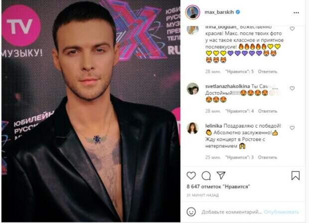 Именно такой бунтарский и одновременно с тем немного дерзкий стиль привлекает фанаток к артисту. Сам певец привык быть в центре внимания, поэтому всегда старается «держать марку». «Классный день был вчера. Осталось приятное послевкусие», - лаконично написал Барских под фото. «Красавчик