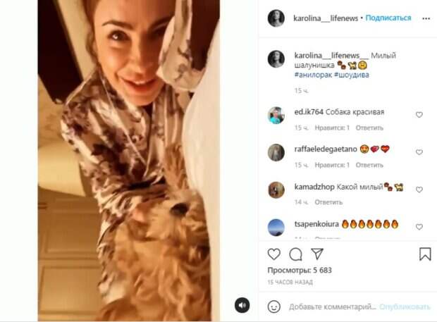 Так, счастливая Каролина позировала в кремовом шелковом халате с цветочным принтом. Девушка лежала на боку на постели, играясь со своим любимцем - собачкой по кличке Тоша. Щенок породы мальтипу (помесь мальтийской болонки с той-пуделем) появился в семье певицы совсем недавно. Кличку малышу, к слову, придумала 9-летняя дочка певицы София. "Милый шалунишка