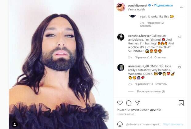 Артист отрастил уже внушительную бороду, которой в свое время так неожиданно привлек внимание всего мира на Евровидении, и теперь никогда не расстается с ней. Томас Нойвирт сделал селфи, немного подняв подбородок вверх, от чего его длинные и густые накрашенные ресницы были видны более отчетливо. Певец позировал в женском наряде черного цвета, который открывал обнаженные накачанные плечи и вид на волосатую грудь звезды. Образ был дополнен густыми полупрозрачными рюшами из фатина, которыми был отделан край одежды на груди. Поклонники Томаса Нойвирта испытали неподдельный восторг при виде своего фаворита в этом узнаваемом образе. В своих восхищенных комментариях они написали много приятных слов и даже назвали артиста "Королевой". "Классно выглядишь", "Выглядишь потрясающе!", "Великолепный и сказочный", "Красивый", "Вызовите скорую, я в обмороке! А пожарники, я горю! И полиция, быть таким удивительным - преступление!", "Вы выглядите действительно фантастически!!!", "Очень красивый. Замечательная королева",- написали поклонники под публикацией певца. Напомним, что совсем недавно Томас Нойвирт поэкспериментировал с образом, надев на себя широкие джинсы и полупрозрачный обтягивающий боди. Певец предстал перед фанатами без нижнего белья, что было заметно благодаря приспущенным брюкам. Напомним, звезда "Евровидения" Кончита Вурст обтянул свои рельефы латексом и разбередил фантазии: "Стыдно даже говорить…" Как сообщала Politeka, заросшая звезда "Евровидения" Кончита Вурст показал мускулы в неожиданном месте: "У тебя там уже..." Также Politeka писала, что 47-летняя Хайди Клум в одних стрингах довела до приятной дрожи своими формами: "Оставайся в постели"