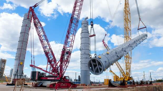 Буквально недавно, в мае, стало известно про то, что строительство нового олефинового комплекса только выходит на этап строительства. На тот момент сами строительные работы не начались. И вот на дворе начало июля, прошло полтора месяца, а на площадке уже устанавливают третью гигантскую колонну.