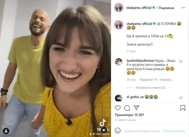 На кадрах Даша снимает, как идет по коридору, а рядом с ней можно заметить смущенного танцора. «Люди, вы не поверите! Я тут такого жеребца поймала! Он идет и еще ржет! У меня такого еще не было! Лысый! Вот смотрите, башкой как блестит. Вот это жеребец! Поведу к своей кобыле», - произносит девушка. Все это время они с Ямой заливаются хохотом. «Это истерика. Еще и залетело в TilTok на 1,4 лимона. Знаете артистку?», - подписал кадры хореограф. Стоит отметить, что юмор оценили не все. «Нуууу .... Если бы я встретила своего кумира, у меня была бы другая реакция», «Перебор.. За гранью дозволенного», «Все так наиграно», «Это только мне не смешно а стыдно почему-то за ее слова», - пишут люди. Напомним, Яма из "Танців з зірками" достал позорную оценку. Как сообщала Politeka, Влад Яма из "Танців з зірками" разжег интерес кадрами с женой и новым судьей Чмерковским. Также Politeka писала, что жена Влада Ямы из "Танців з зірками" показала, что ей довелось делать в прямом эфире с Писанкой.