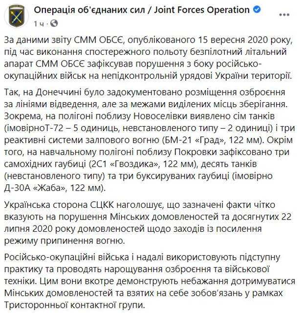 Выполняя наблюдательный полет беспилотный летательный аппарат миссии зафиксировал нарушение договоренностей со стороны российско-оккупационных войск на территории ОРДЛО. Так, на полигоне близ Новоселовки обнаружено семь танков (вероятно Т-72 - 5 единиц, неустановленного типа - 2 единицы) и три реактивные системы залпового огня (БМ-21 "Град", 122 мм). Кроме того, на учебном полигоне вблизи Покровки зафиксировано три самоходные гаубицы (2С1 "Гвоздика", 122 мм), десять танков (неустановленного типа) и три буксируемые гаубицы (предположительно Д-30А "Лягушка", 122 мм). В сообщении штаба ООС говорится, что российско-оккупационные войска и в дальнейшем используют коварную практику и готовят наращивание вооружения и военной техники. Этим они в очередной раз демонстрируют нежелание соблюдать Минские договоренности и взятые на себя обязательства в рамках Трехсторонней контактной группы. Напомним, угрозы главаря боевиков Пушилина оказались пустым звуком: "ВСУ приготовились, но...". Как сообщала Politeka, скандал разгорелся в верхушке "ДНР", Пушилин пошел наперекор Басурину. Также Politeka писала, что российский наемник избил шишку из " ДНР " Басурина в ресторане Донецка.