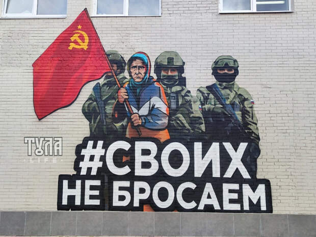 В Туле на Казанской набережной, на стене здания на Металлистов, 2 завершили граффити с изображением пожилой женщины с красным флагом. За ее спиной изобразили российских военнослужащих. В Сети в начале апреля появилось видео, на которой бабушка встретила прибывших в ее село украинских военных со знаменем Победы.