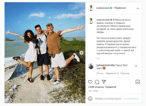 Андраде также ведет Инстаграм, где публикует часть контента. На новых кадрах девушка показала, как проводит время в Мексике. Мишель показала не только себя, но и фламинго, паука, различных насекомых, закат, джунгли и многое другое. "В Мексике было жарко, сложно и страшно моментами! Много насекомых, комаров, за нами даже охотились оводы. Но помимо всего этого, вокруг красота, дикие джунгли, яркие закаты. Я первый раз в жизни увидела фламинго и познакомилась с цивилизацией майя — какой же крутой выпуск получился!", - написала Мишель. Фанаты поставили более 3 тысяч лайков и написали комментарии: "Классно, ждем выпуск", "Когда новая музыка", "Мишель, ты красотка", "Когда выйдут песни Жизненно важное и Criminal?". Напомним, подопечная Потапа Андраде засветилась на яхте с эффектной спутницей А еще Politeka сообщала, что подопечная Потапа Андраде в расстегнутой рубашке показала свои наслаждения на дикой природе Также Politeka писала, что подопечная Потапа Андраде нарвалась на критику в роли ведущей "Орла и решки"