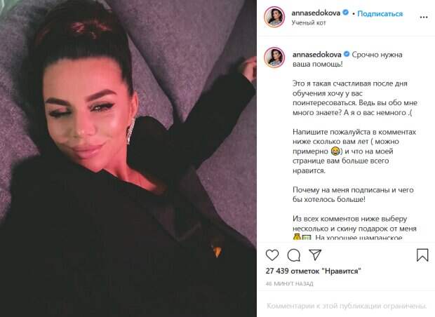 Известная украинская певица Анна Седокова показала, как расслабляется после удачного дня, и попросила о помощи Звезда опубликовала пост в Инстаграм с призывом к своим поклонникам, сообщает Politeka.net. «Срочно нужна ваша помощь! Это я такая счастливая после дня обучения хочу у вас поинтересоваться.