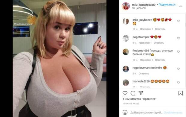 Украинская модель плюс-сайз Мила Кузнецова сводила своих "близняшек" в кино Как передает Politeka.net, счастливая обладательница форм 15-го размера опубликовала свежее фото в своем микроблоге в Инстаграм, в котором предстала в соблазнительном наряде. Девушка крупным планом засняла свою пышную "гордость", что успела растянуть белую кофточку до предела.