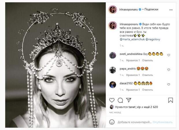 Шикарная корона с множеством элементов красовалась на звезде. "Веди себя как-будто тебе все равно. В итоге тебе правда все равно и бум, ты счастлива", - написала красотка под фотографией. Фанаты поставили более 2 тысяч лайков и написали комментарии: "Вау", "Как правильно сказано", "Принцесса", "Украинская Роксолана", "Шальная императрица", "Просто без слов", "Ну Ирина, огонь", "Кокошник - это сила", "Моя ты королева", "Ты Полякову сьела", "Извините, я случайно , я хотел написать "вам очень идёт" - телефон глюканул". Мы писали, что звезда "Женского квартала" Ирина Сопонару превратилась в нежную принцессу в новом имидже. На новом кадре Ирина предстала в кремовом платье оригинального дизайна без принтов и ярких украшений. Напомним, раздетая Сопонару из "Женского квартала" понежилась в ванне, дав "подсмотреть" А еще Politeka писала, что раскрепощенная блондинка из "Женского квартала" в полупрозрачном белье разожгла огонь страсти Также Politeka сообщала, что блондинка из "Женского квартала" в кружевах заставила Кошевого и других мужчин глотать слюнки